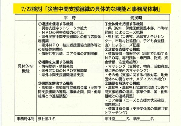 高知県地域福祉政策課との対面での定例会を重ね、下記の項目について協議を重ねました。- 災害中間支援組織の活動支援体制の可視化