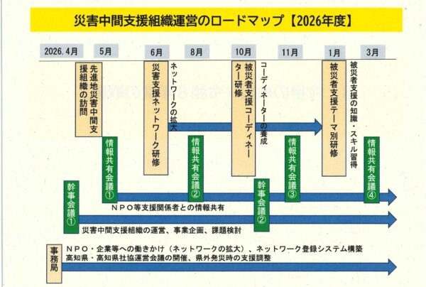 2026年2月12日、高知県・高知県社会福祉協議会・JVOADの三者による「災害中間支援組織の設置及び運営等に関する協定」が締結され、「高知県災害中間支援組織」の設置と「こうち災害支援ネットワーク」が発足しました。